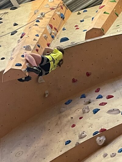 We beginnen rustig met een 5b achter in de hoek om een beetje in te klimmen en verhuizen dan al snel via een 6a naar een 5c overhang. In de overhang wordt goed duidelijk waar de kracht en waar de souplesse zit. Ik probeer hierbij niet alleen zelf aanwijzingen te geven maar vraag ook de klimmers zelf te kijken en te reageren wanneer ze zien dat het anders of beter kan. Het is mooi om te zien hoe ze elkaar aanvullen al is het soms best lastig om je te verplaatsen in iemand die kleiner en minder sterk is dan jijzelf.