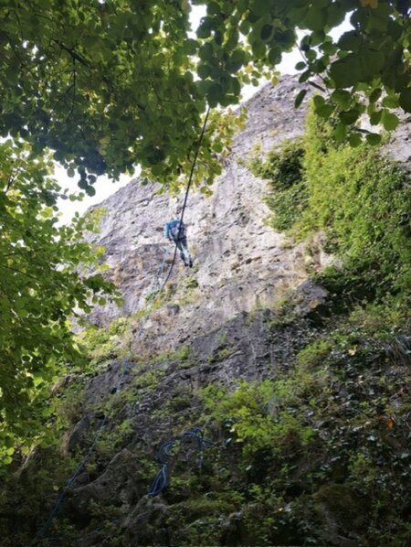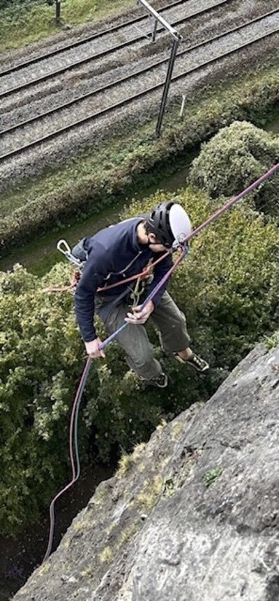 In september en oktober 2025 organiseerde de NKBV Noord-Holland een cursus multipitch outdoor rotsklimmen. We begonnen met twee zaterdagen in Spaarnwoude, waar de “rotsen” bestaan uit betonnen afgietsels van het Belgische origineel. Daarna gingen we een weekend naar de Ardennen voor het grote werk. In de buurt van Namen in de Belgische Ardennen kun je langs de Maas op verticale kalksteen klimmen. Onder begeleiding van ervaren instructeurs leerden de deelnemers hoe je meerdere touwlengtes klimt zonder daarbij in de knoop te raken met jezelf, je materiaal of je klimmaatje.