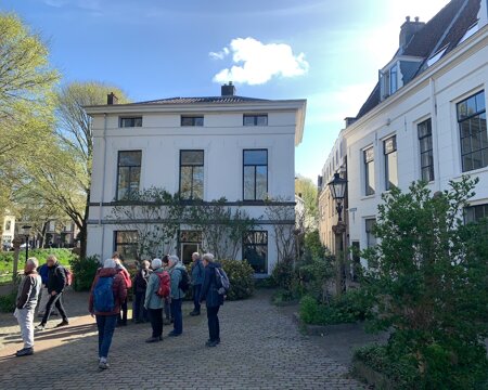 Zondagmorgen 12 april 2026 stond een groep van 16 wandelaars klaar bij het meetingpoint van Utrecht Centraal onder leiding van Herman Lohman. Het was prachtig fris en zonnig voorjaarsweer. Overal stonden bomen en struiken te bloeien hier en al gesierd met ontluikend groen. We wandelden eerst de trappen af richting Vredenburg en liepen langs een gracht met daarin een middeleeuwse houten Stadskraan, het Nijntje Pleintje, een buste voor Anton Geesink en het kantoor tegenover de oudste kroeg van Utrecht waar Herman een groot deel van zijn werkende bestaan heeft doorgebracht.